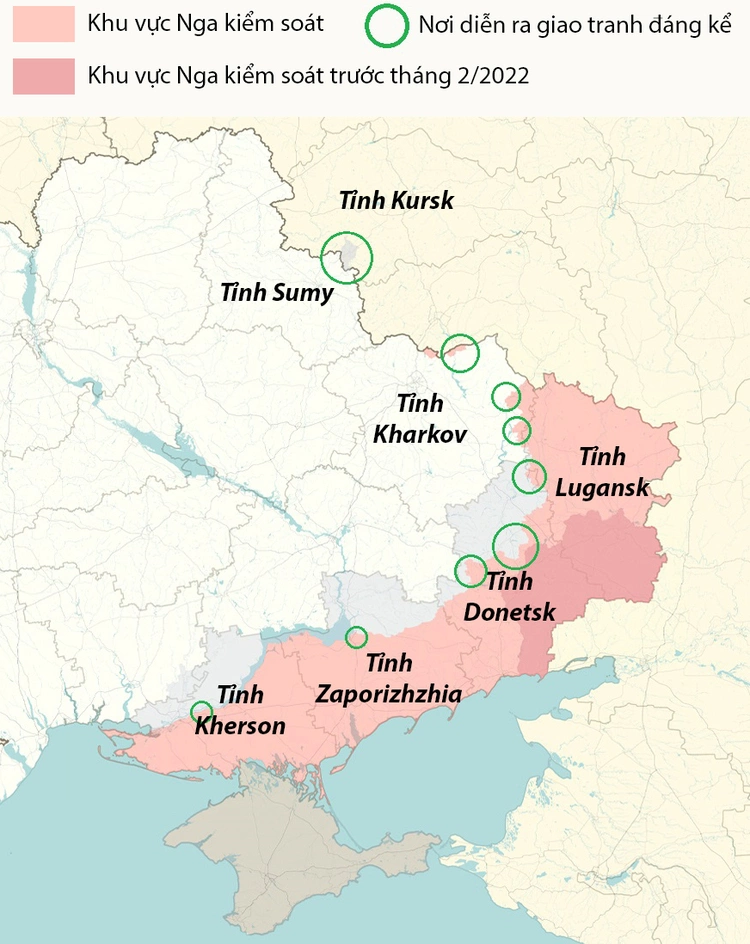 Khu vực diễn ra giao tranh trên chiến tuyến Nga - Ukraine. Đồ họa: RYV